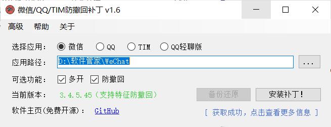 软件介绍 微信/QQ/TIM防撤回补丁,适用于 Windows 下 PC 版微信/QQ/TIM的防撤回补丁,支持最新版微信/QQ/TIM,其中微信能够选择安装多开功能。 ...