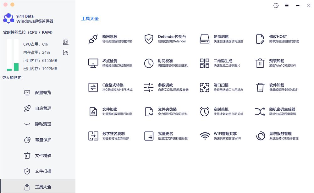 Windows 超级管理器是一款免费无广且功能强大的系统管理软件。其采用 易语言 开发,提供全面的系统检测,例如硬件实时监控、电脑垃圾及隐私清理、启动项管理、文件粉碎,可高效地查...