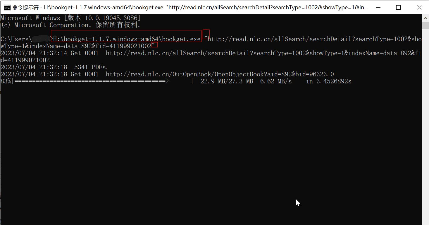 如下图,这时默认下载路径是 C:\Users\用户名;也可以把程序加入系统变量Path变量里,这时可全局调用bookget命令。