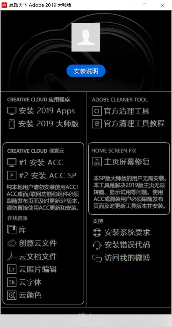 嬴政天下论坛虽然挂了,但是vposy还在,继续默默的更新修改版本的adobe系列,如今2019版本已经和大家见面了,有需要的话自己下载吧。当然了,还是下载单独版本比较快,这个版本有15G,下载都比较麻烦。集成页面: