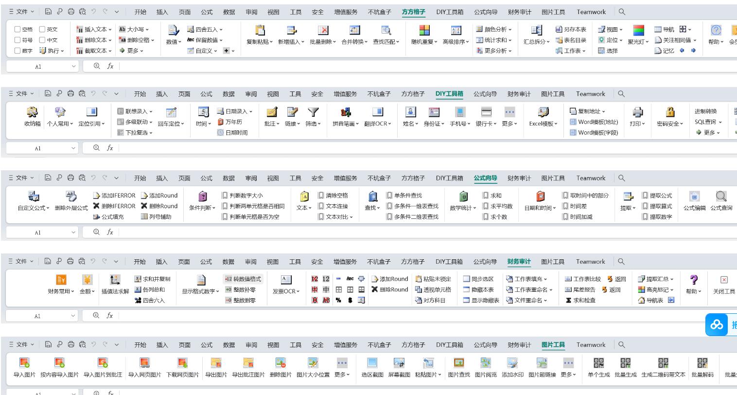 上百个实用功能:文本处理、批量录入、删除工具、合并转换、重复值工具、数据对比、高级排序、颜色排序、合并单元格排序、 聚光灯、宏收纳箱等。