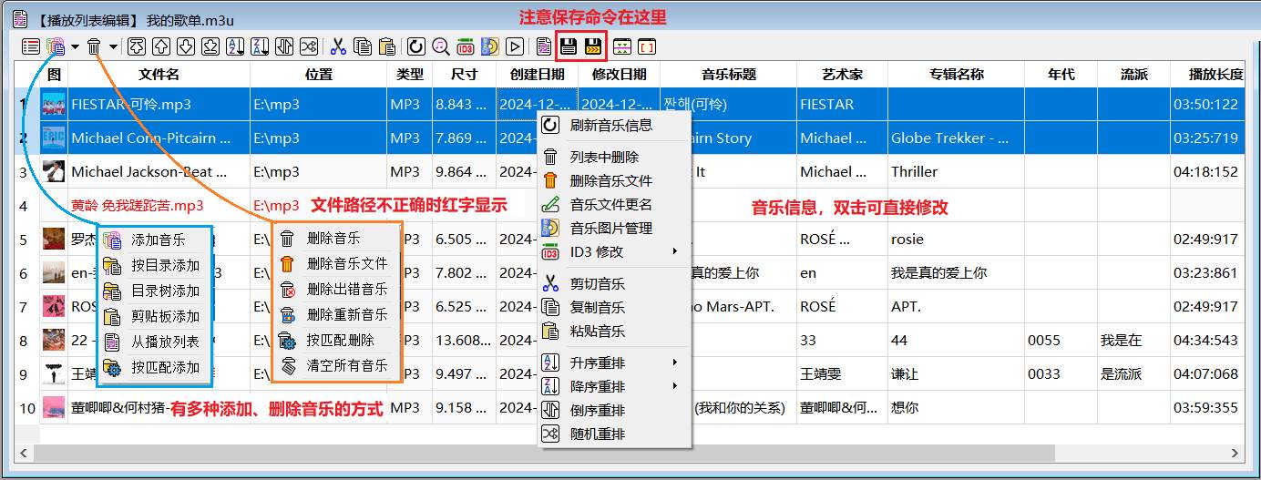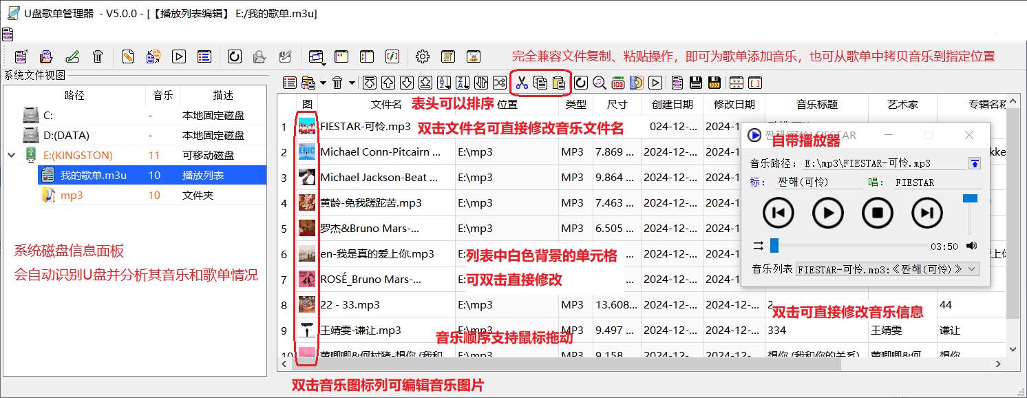 本软件可快速制作音乐播放列表(歌单),对音乐U盘支持友好,同样也可对硬盘上音乐创建歌单。软件还可修改音乐标签信息、内嵌图片等多种功能,也可以移动、转换、合并歌单。可在歌单间也可以进行复制、粘贴操作,甚至可以与资源管理联动。