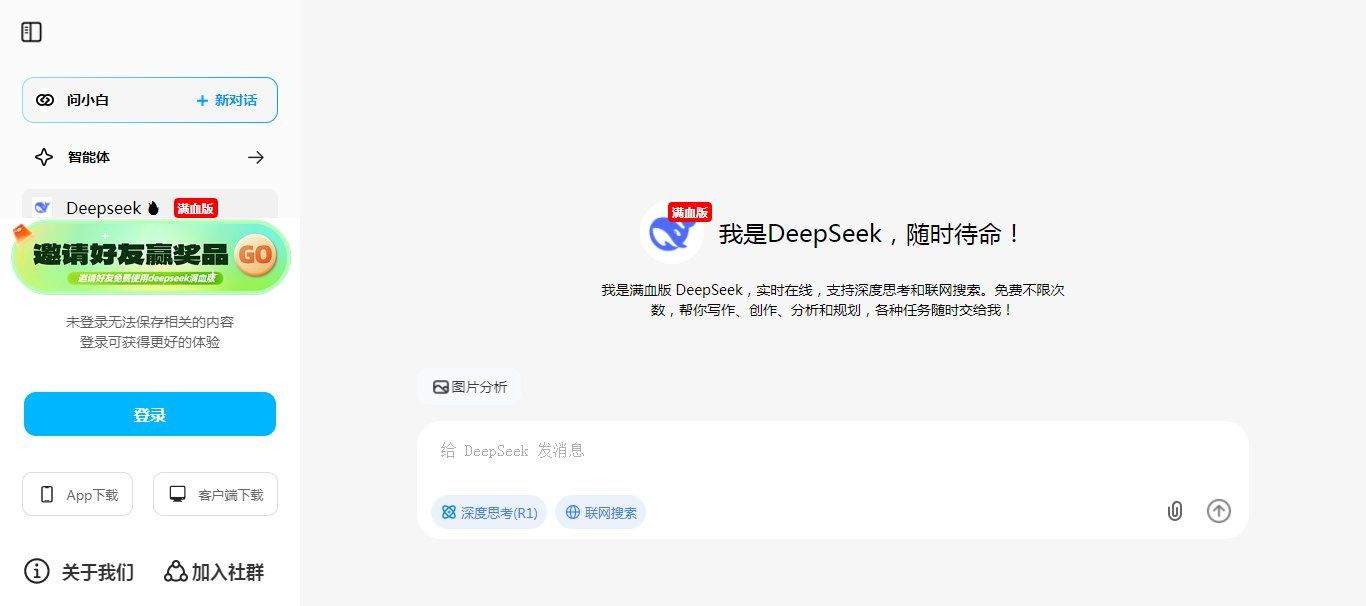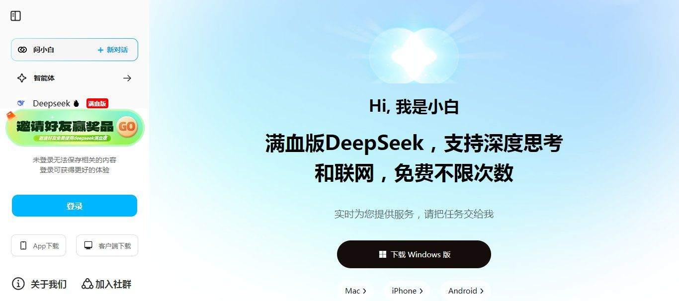 要问今年过年谁最火,除了哪吒2魔童闹海,那肯定就是DeepSeek了。1月份发布了对标OpenAI的推理模型R1,短短几天火爆全球。很多大厂已经接入了DeepSeek,这也导致DeepSeek官方服务器经常繁忙,问问题没有结果。有的童鞋想在本地部署,可是受限于硬件,部署出来也是残血版的DeepSeek。想要愉快的用DeepSeek真是太难了!今天给大家分享的是一个才发现的新软件——问小白。它是目前市面上唯一一个满血版DeepSeek桌面端!除此之外,网页端,手机端,Mac端一个不少。看到有不少童鞋担心是不是免费,目前完全免费,无限制!