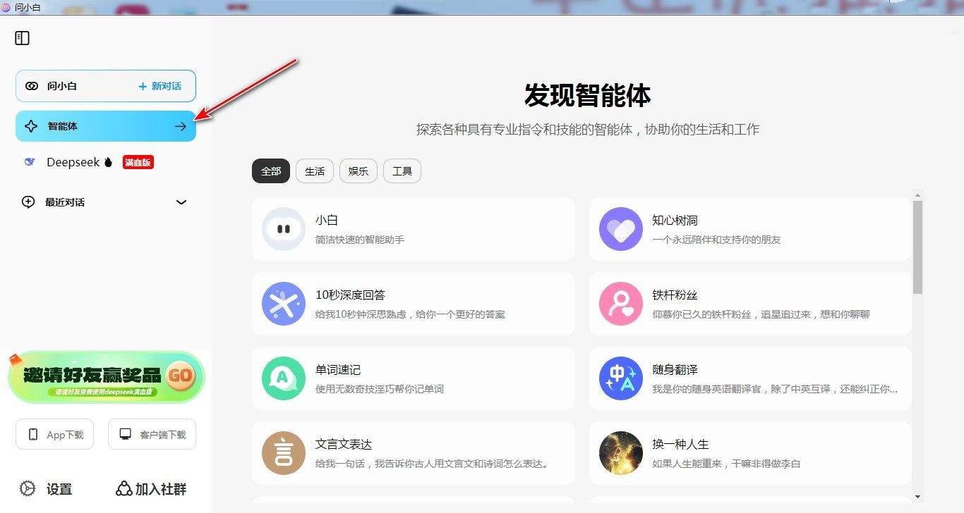 除了DeepSeek,还有AI智能体,这里面有将近三十款工具,比如塔罗牌占卜、小红书文案写手、剧情续写、藏头诗、高情商表达等等非常实用的工具。