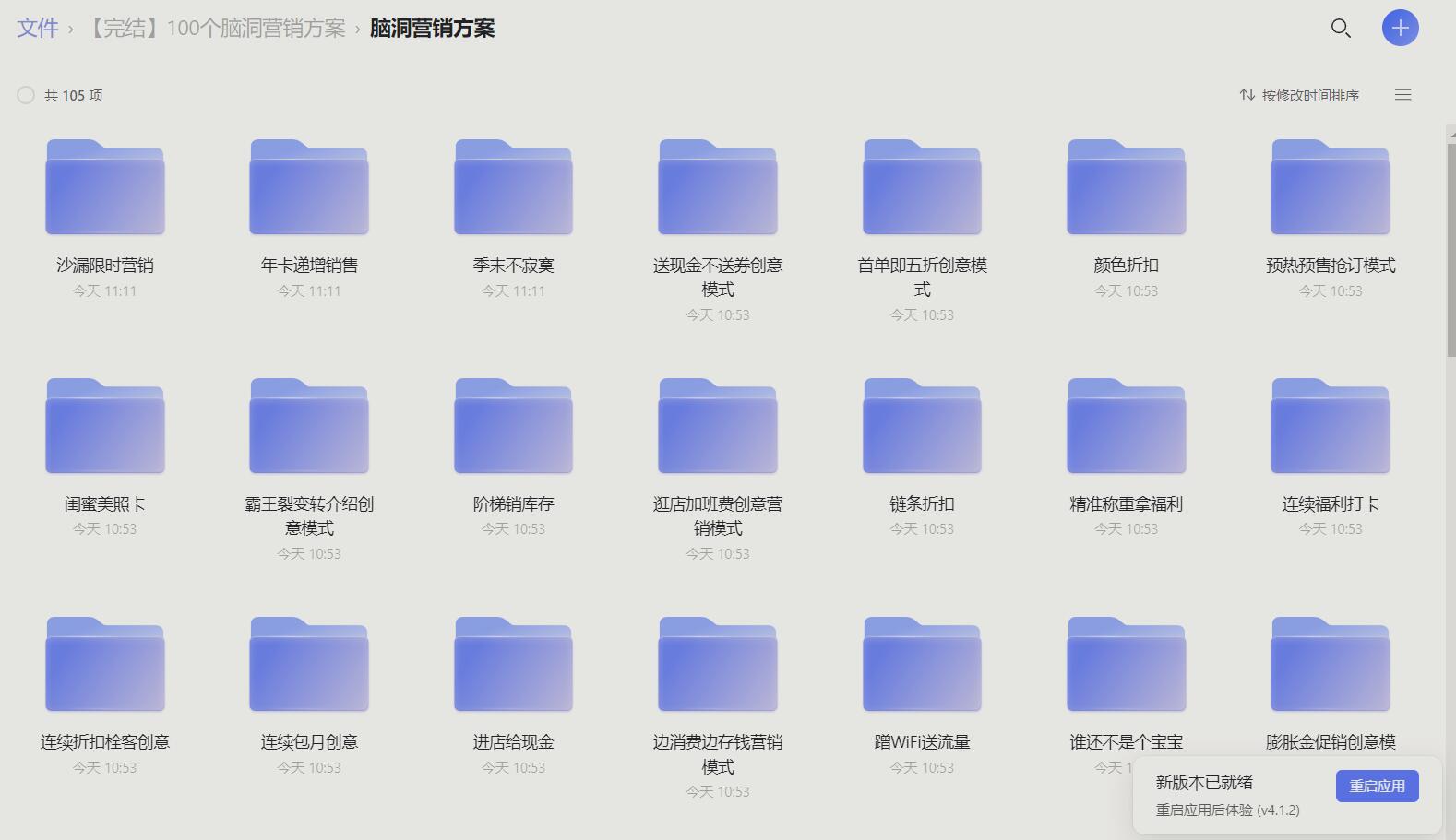 100个脑洞营销方案资源简介: 课程大纲 1元俱乐部创意营销模式 1元秒杀升级玩法 5秒免单 7天劲爆抢创新模式 99全享节营销模式 ...