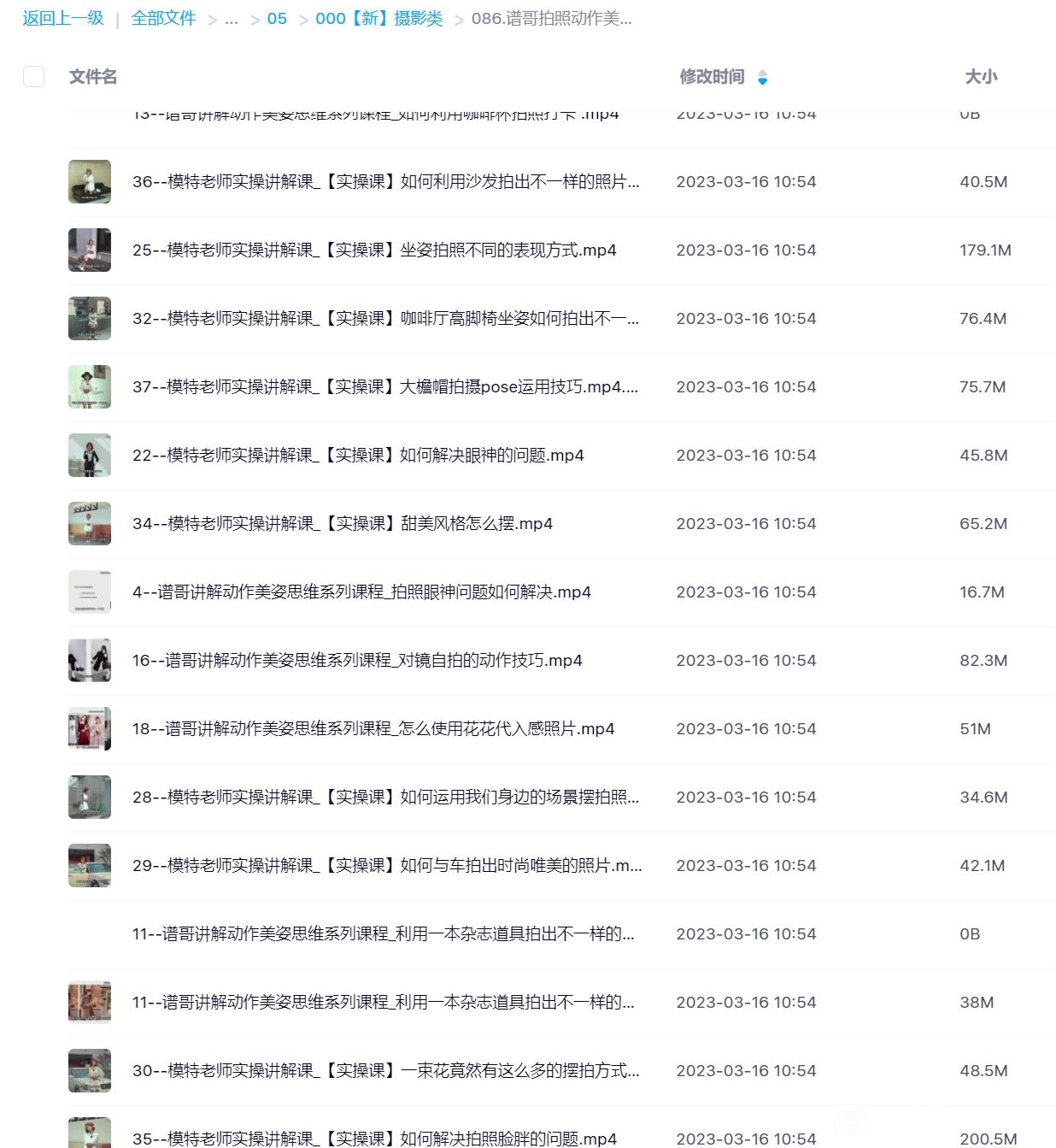 谱哥拍照动作美姿线上视频课女生版 思维+实操 零基础学pose资源简介: 课程目录 1--谱哥讲解动作美姿思维系列课程_前言 .mp4 2--谱哥讲解...