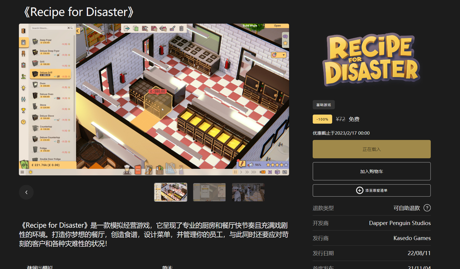 《灾难菜谱》是一款模拟经营游戏,它呈现了专业的厨房和餐厅快节奏且充满戏剧性的环境。打造你梦想的餐厅,创造食谱,设计菜单,并管理你的员工,与此同时还要应对苛刻的客户和各种灾难性的状况...