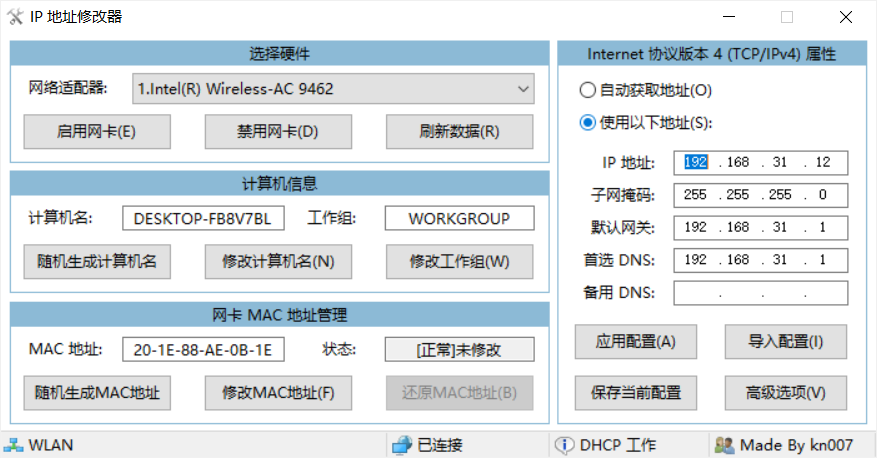 于是开始全网搜索,最后真找到一个,个人人为是目前最好用的IP地址修改工具,今天推荐给大家。软件作者:kn007,工具使用Autoit编写,报毒属正常!