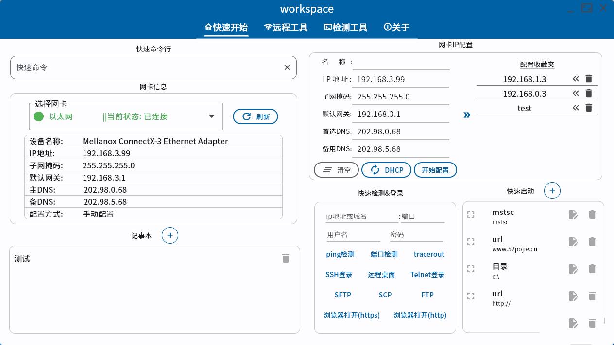 主要功能涵盖了网卡IP配置、网络检测与扫描、记事本、快速启动和登录等功能,还有些功能没想好思路,以后慢慢来。具体使用请查看关于页面,软件仅在Windows11 22H2专业版、Windows Server 2022 Standard 21H2、windows10 企业版LTSC1809、Windows 7 旗舰版SP1系统上进行了简单测试。注意:网卡配置和其他一些功能需要管理员权限运行,提示找不到MSVCP140.dll VCRUNTIME140.dll VCRUNTIME140_1.dll等文件的,需要安装Visual C++ Redistributable for Visual Studio 2015-2019。