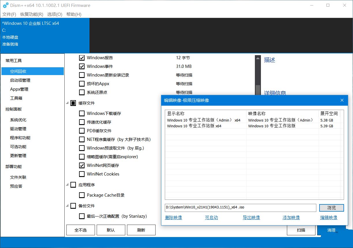 Dism++系统优化工具是一款采用微软内部API编写的免费开源Windows实用工具,Dism系统精简工具最开始的名字叫Windows更新清理工具,Dism++系统补丁更新工具可以深入系统底层清理优化.功能包括:系统优化,空间回收,更新清理,支持ESD转ISO,WIM/ESD互转,Imagex,引导修复,系统备份还原,春哥附体,驱动管理等.