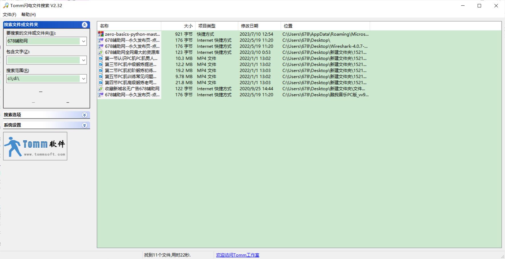 Tomm闪电文件搜索工具是一款高效、便捷的文件搜索工具,能快速定位并查找电脑中的文件,提升工作效率。该搜索器虽然不像Everything一样采取索引制度,不过速度却丝毫不让,即使是500G硬盘也可以不超过30秒。