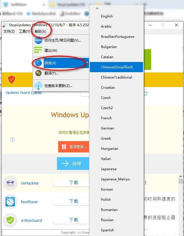 需要注意的是:如下图 选择显示语言步骤。链接绿色版+安装版。使用安装版请默认英文安装,然后再更改语言。绿色版第一次打开会是乱码,更改语言后关闭软件再打开即可。小白提问:为什么要禁用Windows系统更新?