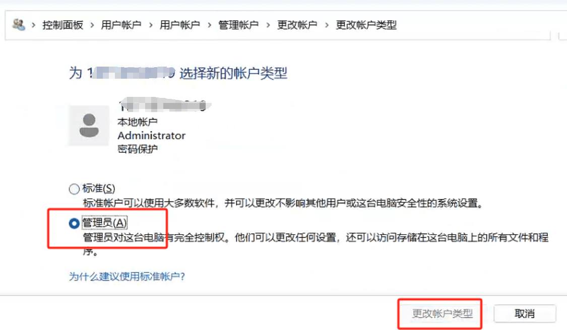 3、查看是否是管理员:控制面板>用户帐户>用户帐户>管理帐户>更改帐户>更改帐户类型