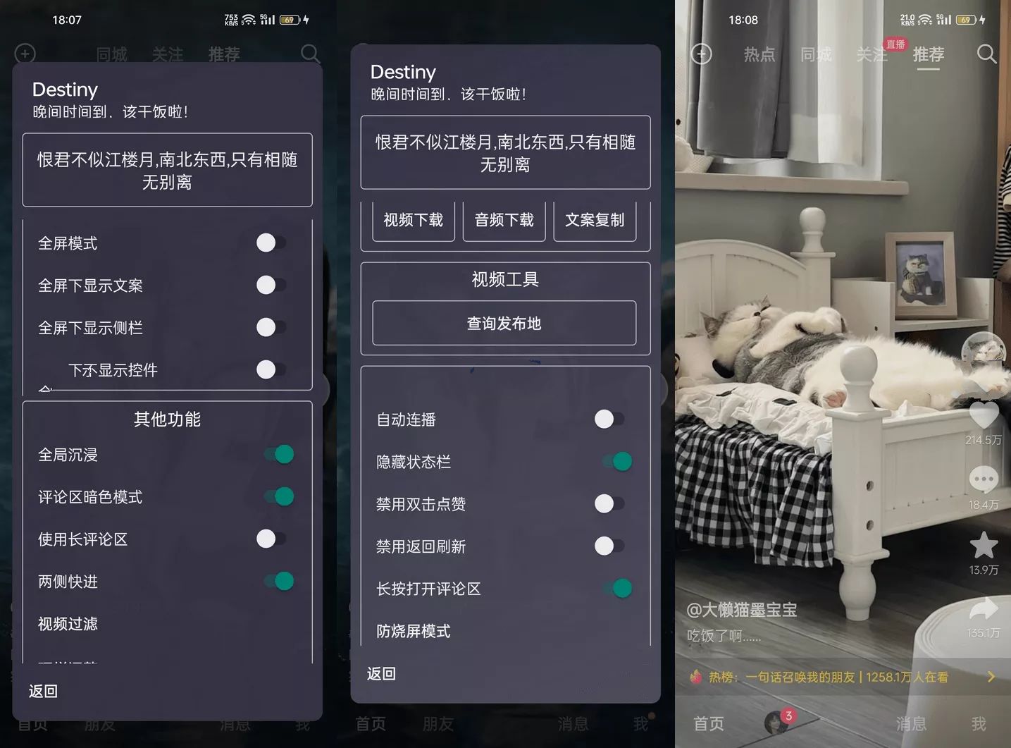 抖音助手(Destiny)功能说明: 大部分功能类似抖音助手模块(抖音+,抖音土拔鼠插件)