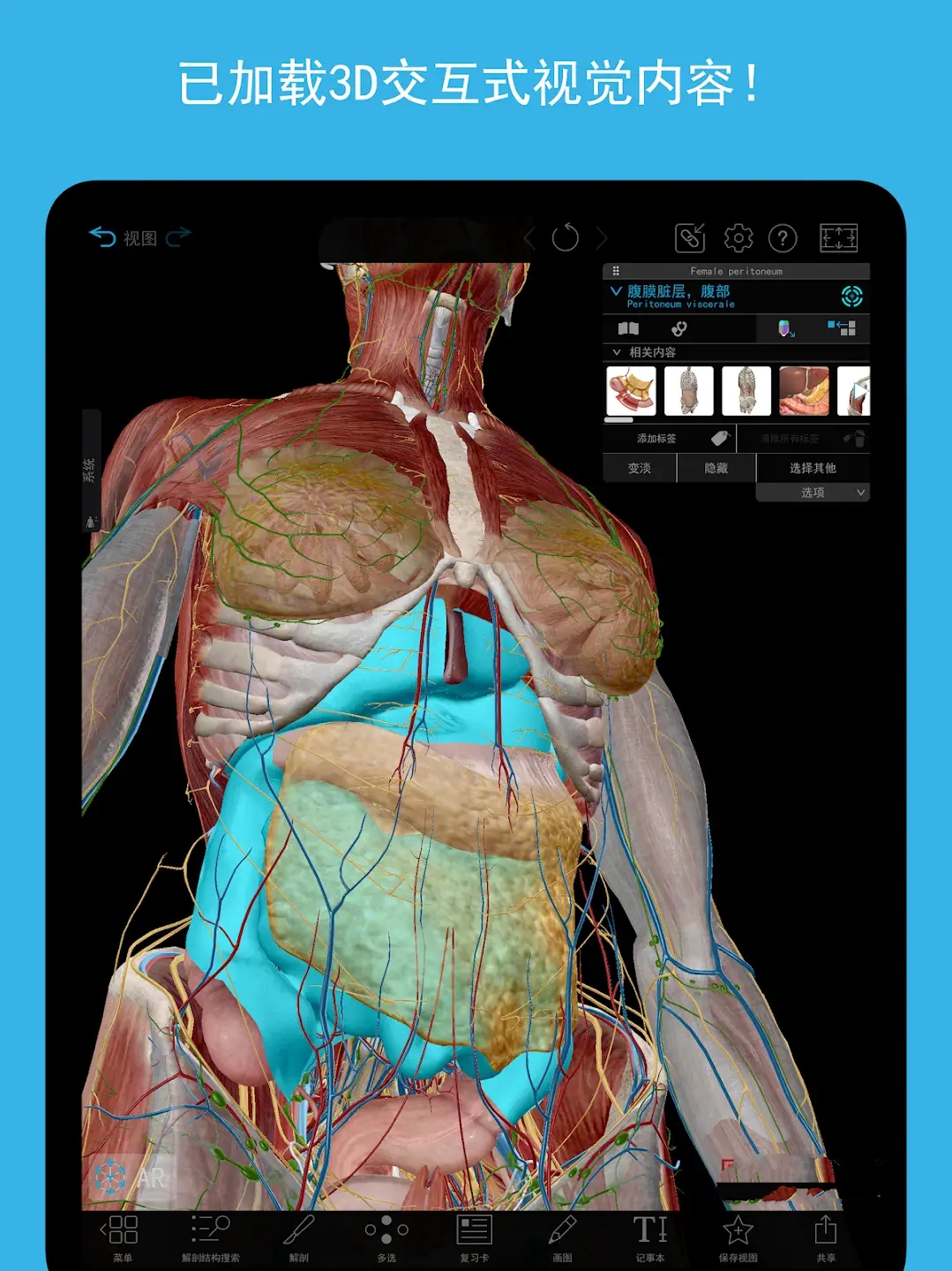 2023+人体解剖学图谱APP是由Visible Body官方发布的2023人体解剖学图谱手机版应用,它是当下最完整且易于使用的3D人体参考和学*工具,是目前现有最全面、最便携的解剖学和生理学参考资料!2023人体解剖学图谱手机版专为解剖学工作人员和学*人员打造,是一款前所未有的人体系统解剖3D互动学*软件。涵盖了人体所有系统和主要器官~您可以在模型中实时3D交互,随时显示隐藏放大缩小透明化处理任意结构,给您一个一步步解剖人体的机会。同时,2023人体解剖学图谱还为您带非常详尽的解剖学模型,让你快速了解人体构造,穴位。为医学和体育学生,也同样面向内科医生、骨科医生、理疗医生、物理治疗师、人体运动学师、医务人员、护士和运动员教练等相关职业提供高效的工具。可以让你了解人体结构的软件,完全3d,你可以通过360°旋转,放大缩小,来详细了解人体各种结构,还可以通过顶部菜单来选择具体某一人体部位。