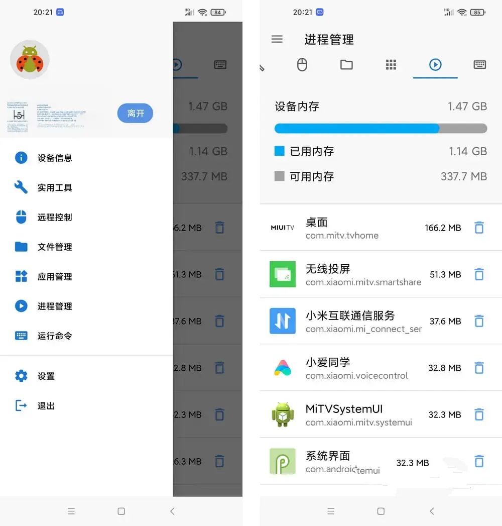 连接好之后就可以获取到电视的设备信息、进程服务、应用管理以及各种自由度很高的设置;无论你是要提取电视应用安装包还是查看某个应用占用多少性能,或者停止某个应用,都可以轻松实现。