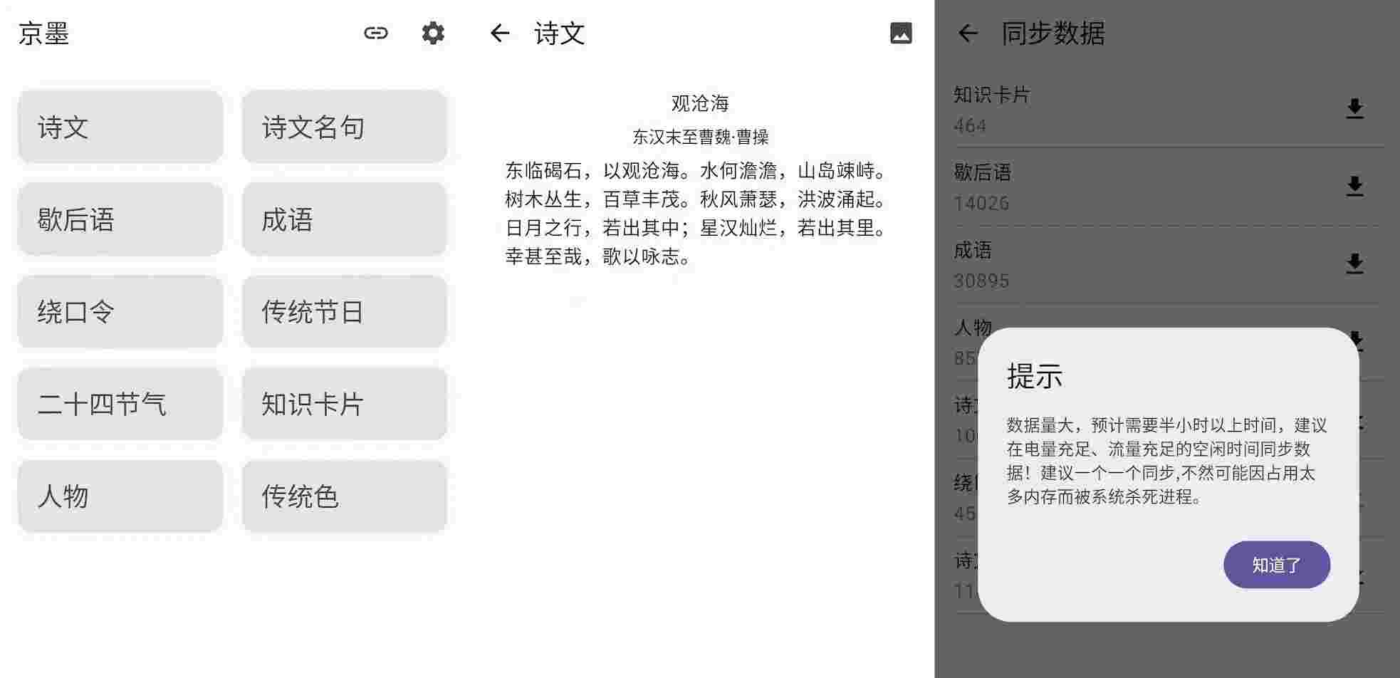 首次使用需点击右上方齿轮跳转“同步数据”(均来源于GitHub开源镜像仓库及某度百科的收集爬取),需自行下载数据,请务必确保显示100%进度下载完成(想要完整导入的请查看下方第二方案)。同步完成方可完全离线使用,选择对应的版块浏览(不需要的可在齿轮设置中的“栏目管理”关闭),也可在右上角进行搜索,便能了解、查询、注释、出处、赏析等等,支持长按文本复制及书签保存。1.9.0及之后的版本已全面支持导入诗词源数据,也就是可到下方网盘下载对应版块的数据导入至手机内部Download文件夹当中即可方便离线使用,即第二方案。经测试完全可行可用。具体如下:
