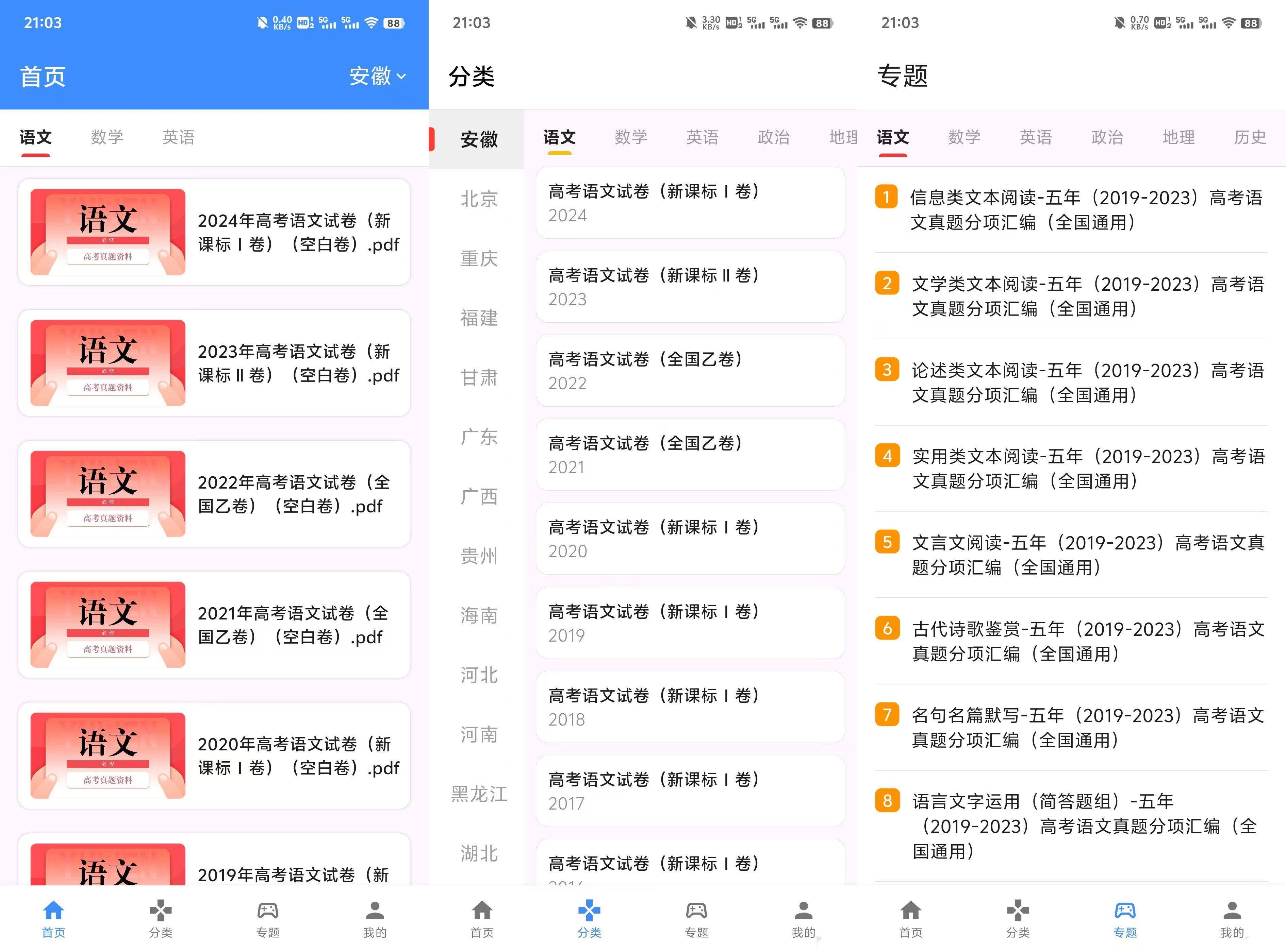 2. 增加了专题试卷(例如语文作文专题,汇聚不同年份的所有作文题库)