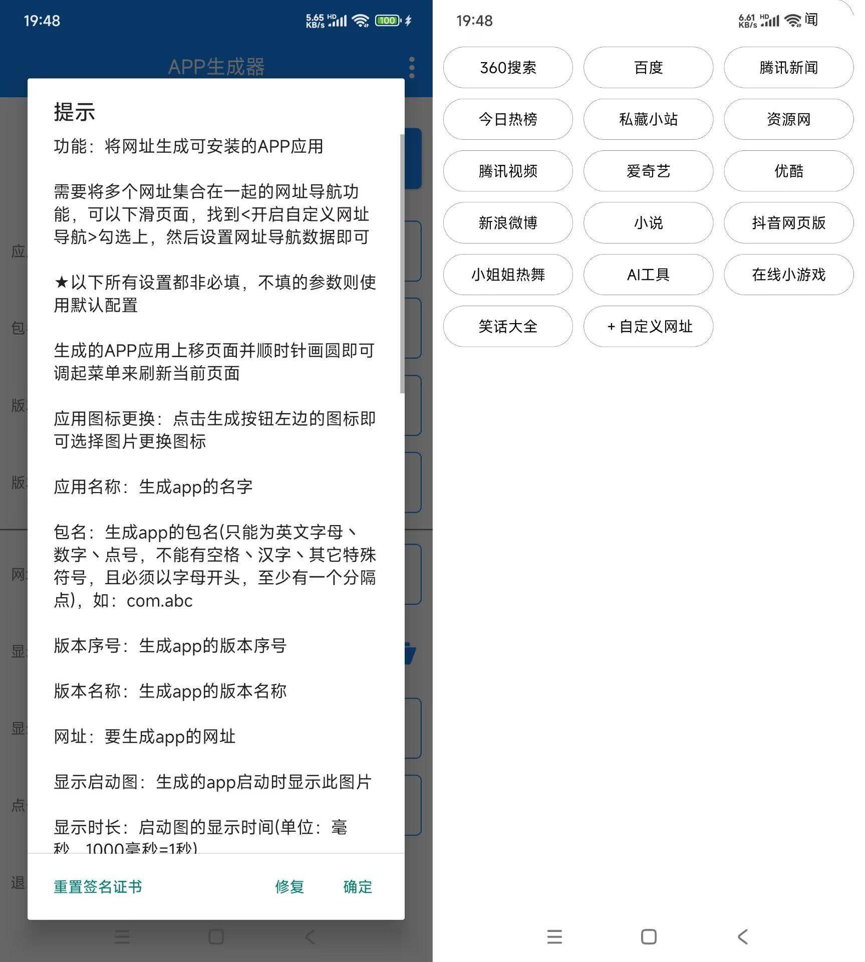 APP生成器可以将任意网址转换成可安装的APP应用,无论是新闻、博客、论坛、游戏,还是在线购物网站或者视频观影平台,只要你有个希望转换的网址,这款应用都能为你实现,无需联网生成,并且支持多个网址集合在一起生成网址导航页面,应用永久免费使用。主要功能亮点: