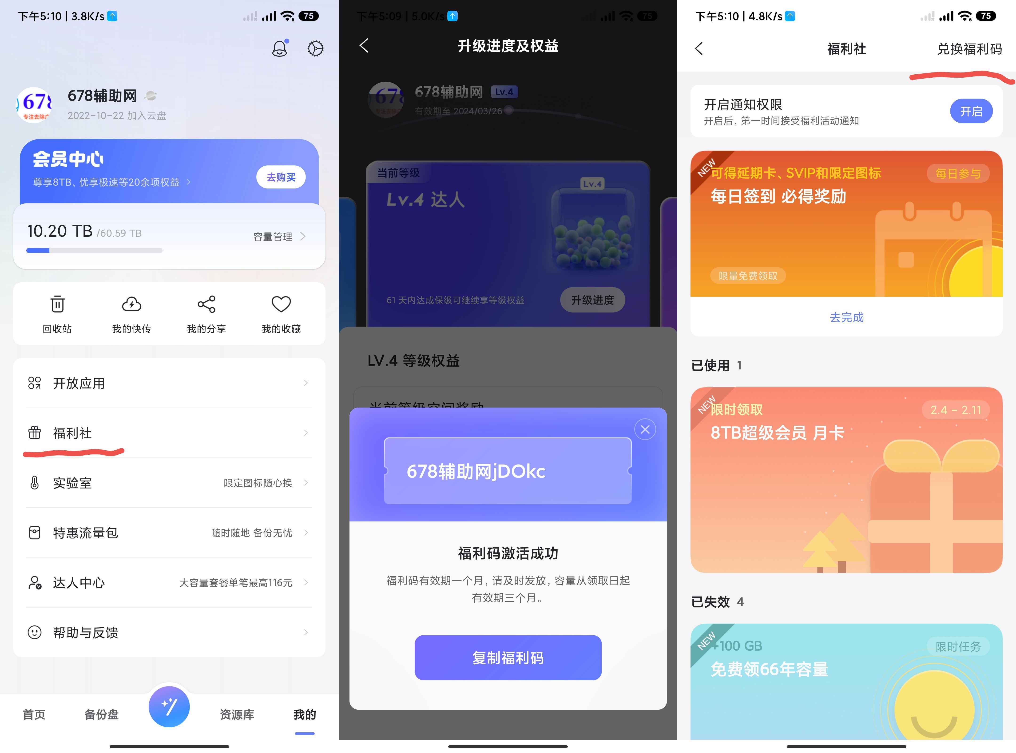下载阿里云盘APP->登录后点左侧->福利社->右上角->兑换福利码->输入下面兑换码