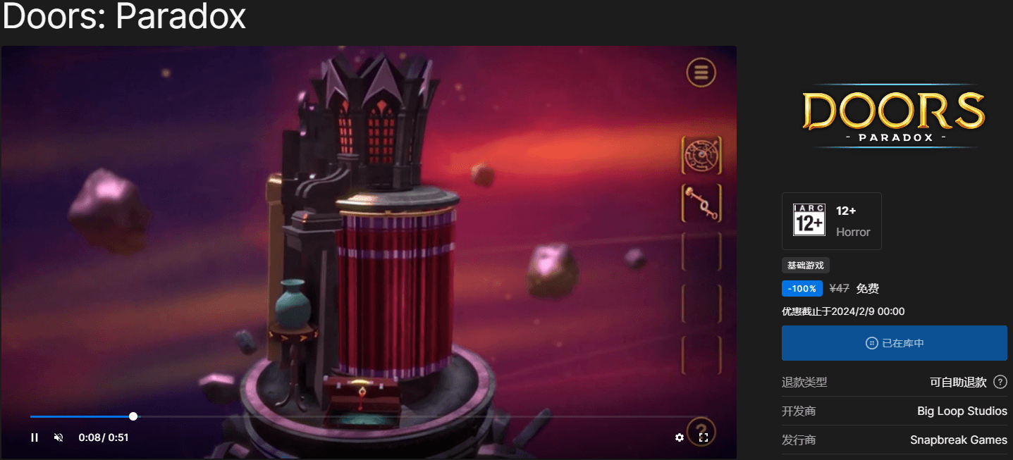 领取地址:https://store.epicgames.com/zh-CN/p/doors-paradox-5896c7