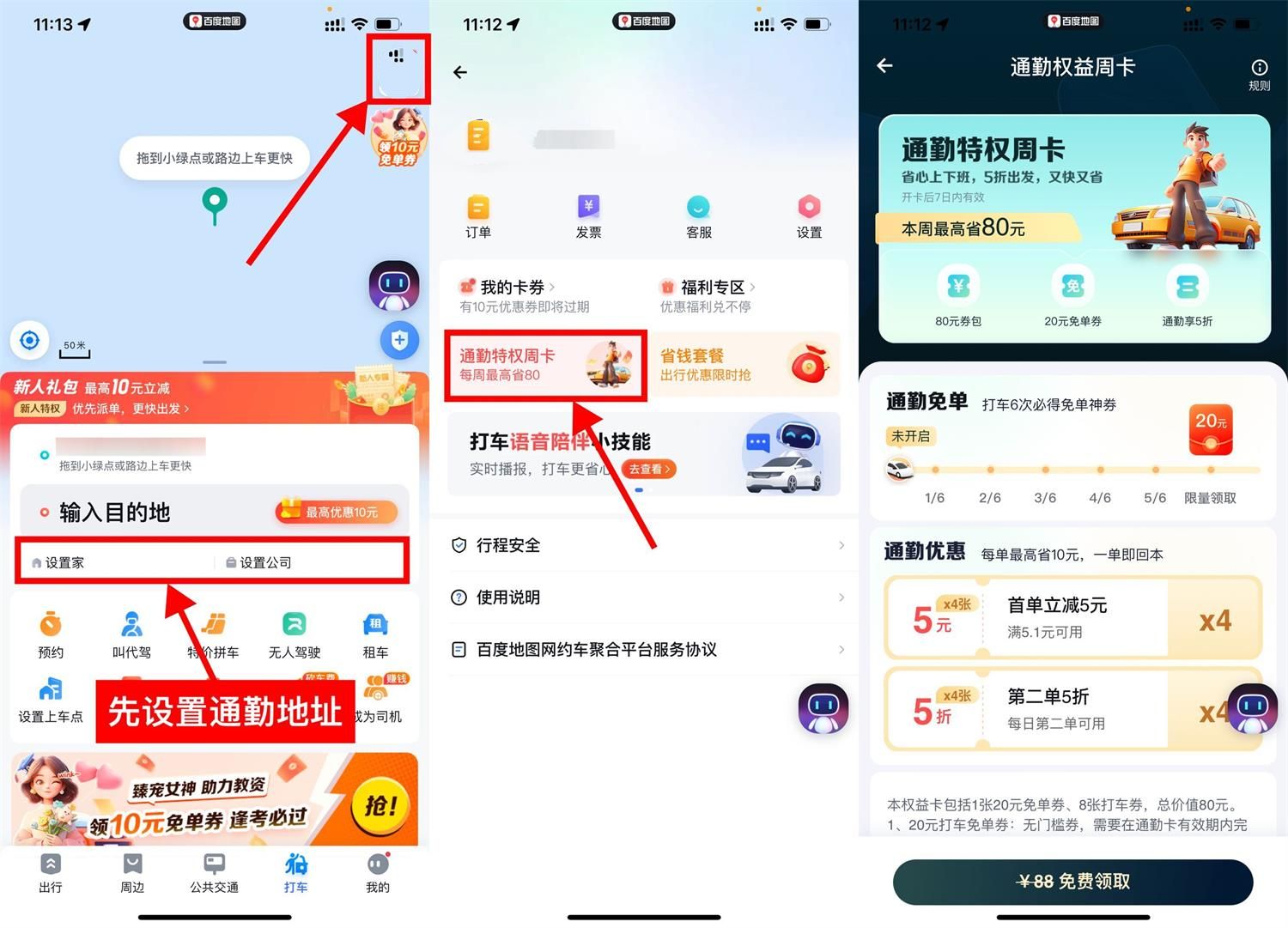 百度地图APP底部“打车”->先设置通勤地址->右上角头像进入->通勤特权周卡->直接领4张5元券+4张5折券,完成6次通勤打车还能领20元无门槛打车券