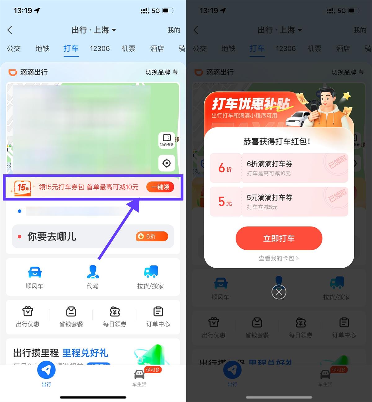支付宝首页“出行”顶部“打车”右上角切换品牌,默认应该是高德打车,切换滴滴打车 地图下方有打车立减券和折扣券-