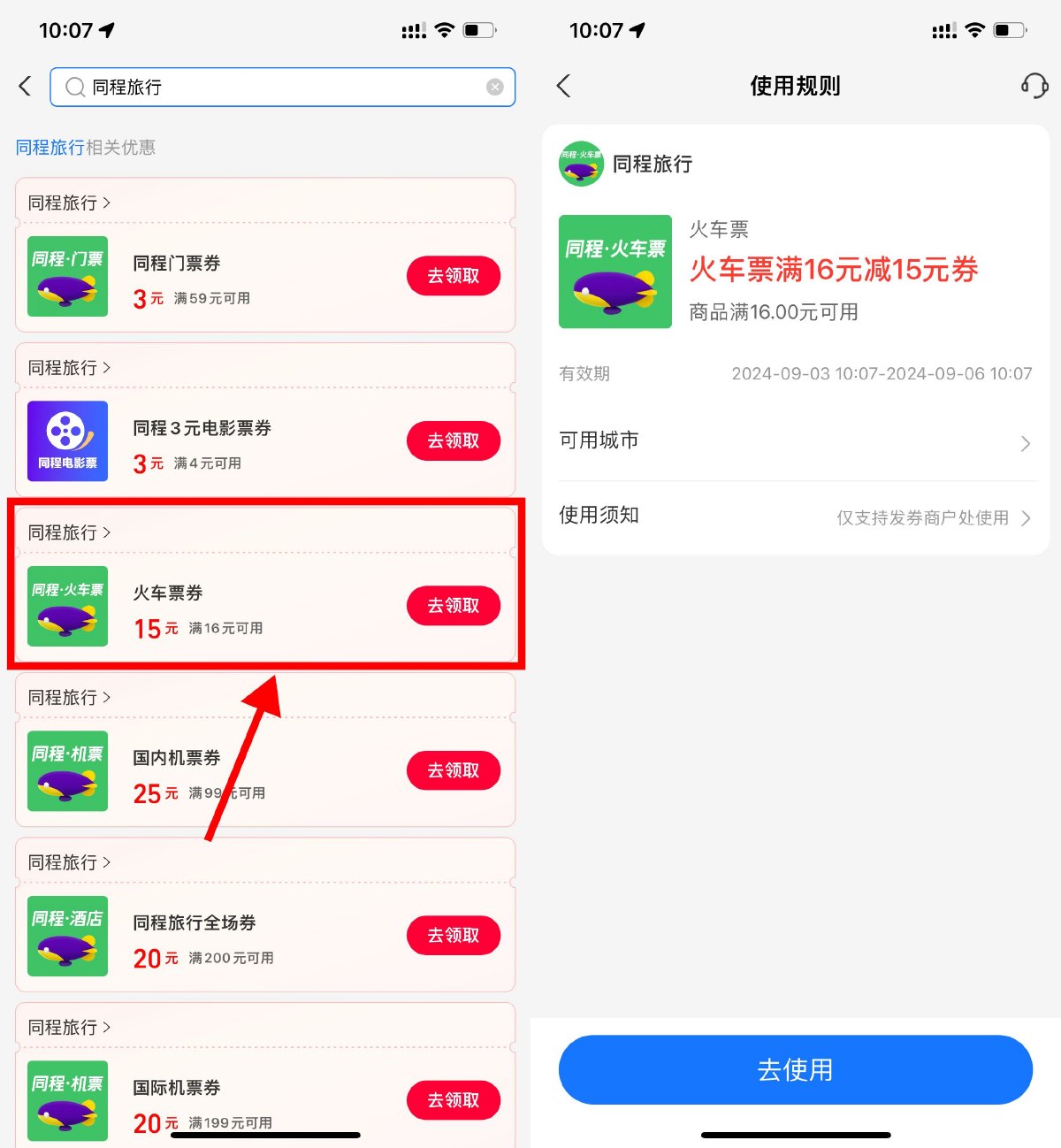 支付宝搜索“消费券”->进入再搜索“同程旅行”->直接领16-15亓火车票券,刚好要出行的可以领下!