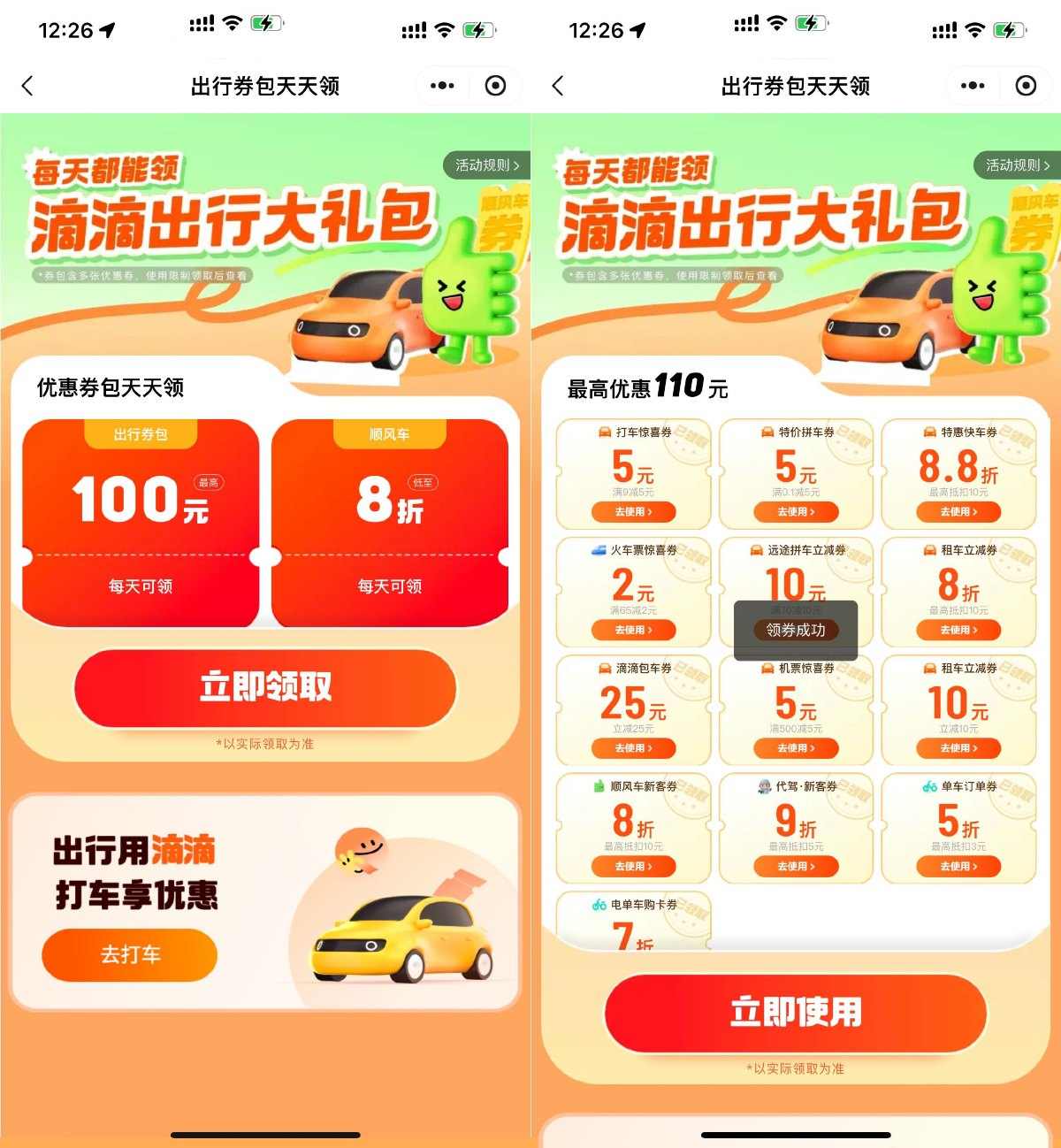 打开活动地址->登陆后直接领,其中包含9减5亓打车券+5亓无门槛拼车券+8折顺风车券