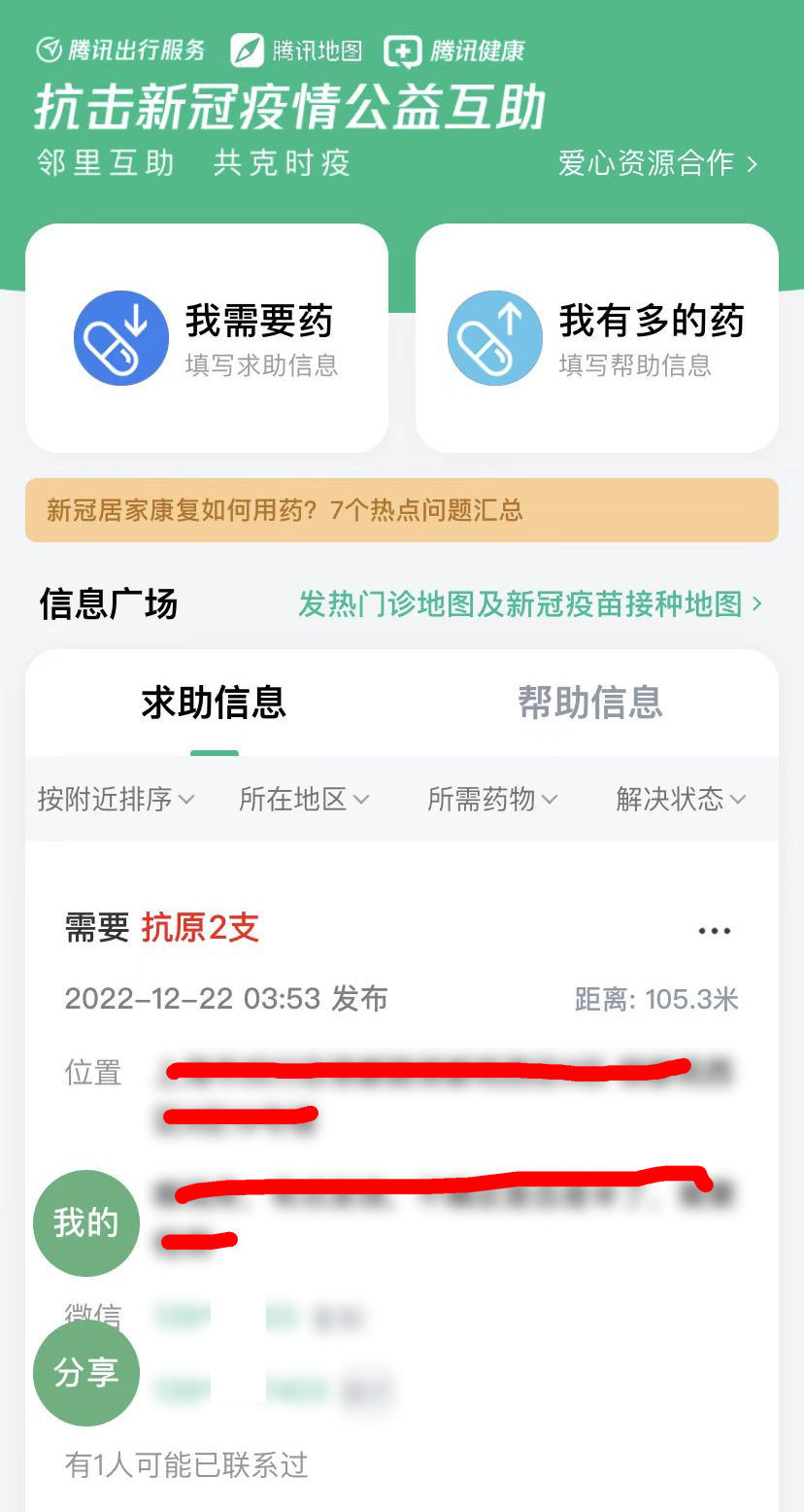 打开后,可以看到附近人的药品需求,经过身份认证后即可查看对方的联系方式,药品多的可以分一些给邻居,解决燃眉之急。