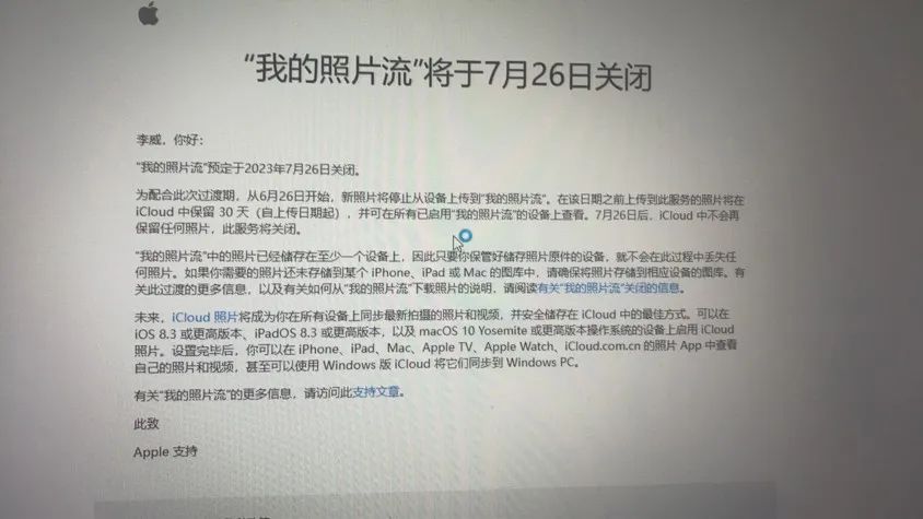 苹果公司表示,从 6 月 26 日开始,新照片将停止从设备上传到“我的照片流”,在该日期之前上传到此服务的照片将在 iCloud 中保留 30 天(自上传日期起),并可在所有已启用“我的照片流的设备上查看。7 月 26 后,iCloud 中不会再保留任何照片,此服务将关闭。