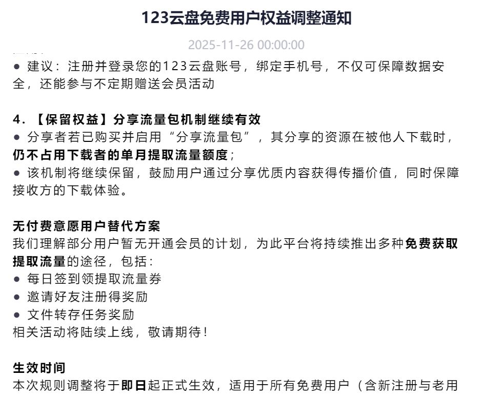11 月 26 日消息,123 云盘今日发布免费用户权益调整通知,表示随着用户量的快速增长,平台面临着日益严峻的运营挑战。