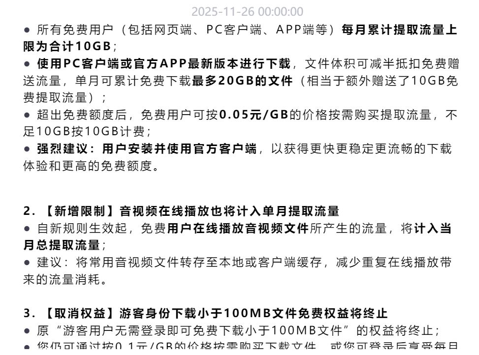 原“游客用户无需登录即可免费下载小于 100MB 文件”的权益将终止;